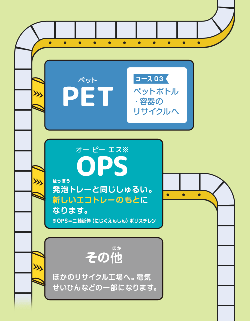 「PET」「OPS」「PP」という3つのプラスチックを、みどりいろ・きいろ・あかいろで分けて選別できる最新のきかいがある工場もあるよ! このシステムは「マークトレー方式」といってこれまでよりもたくさんの容器を選別することができるよ。