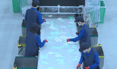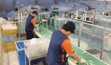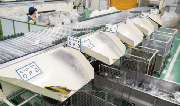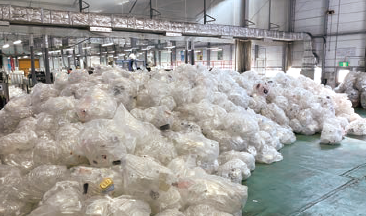 リサイクルボックスで回収した、つかいおわった透明容器をエフピコにあつめます。 まいにちたくさんのトレーがはこばれます。