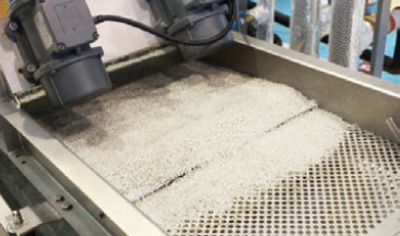 とかしたトレーを、おこめのようなつぶにします。このつぶをペレットといいます。 このペレットが、あたらしい透明容器のもとになります。
